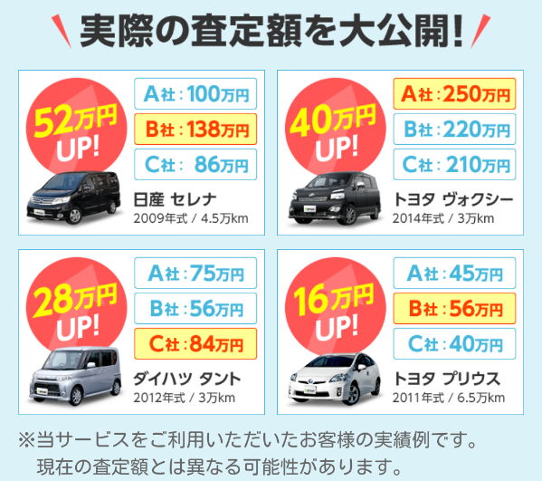 じゃあ、高額査定を出してくれる車買取業者の査定だけを受ければいいんじゃないの? けれど、上に記した通りいろいろな要因によって査定額が決まるため、この車屋が高く買取してくれるとは言えません。 だからこそ複数の買取店の査定を受け、高額査定を出してくれる業者を探す必要があるのです。 複数の買取店の車の査定を受けることで、買取業者同士を競わせて査定額を上げることもできるんです。 ただ、たくさんの車買取店を回り、査定を受けるのは大変ですよね。そこで便利なのが、“車買取一括査定サイト”です。 車買取一括査定を利用すれば、複数の車買取店があなたの自宅まで査定をしにきてくれるんです。もちろん無料です。 今までこういったサイトを利用した事がない人からすると、「それほど買取査定に違いはでないでしょ・・・」と思うかもしれません。 しかし実際に査定に出すと驚きの結果が出る事が良くあります。 例を出すと・・・ と言うような形で、業者によってかなり差が出る事があります。 このような理由から、一社に下取りや買取の見積もりを出すよりも複数から取る必要があり、その面倒な手間を全て省いてくれるのが、ネットの一括買い取り査定なのです。 また、こういった買取の相場は日々変動しますので、出来れば車の売却や購入が近くなってから一気に複数社から見積もりをお願いする事がオススメです。 実際に車の査定でお店に持ち込む場合、どこに注意していけば査定額を上げることが出来ると思いますか? 今までの事故歴やメンテナンス具合や走行距離も十分関係してきますが、大事なのは中身だけではありません。 実は外見も重要なのです。 中古車の査定で何より査定士が気にするのは、「車がいかに大切に乗られてきたか」ということ。 誰だって汚れてぼろぼろの車には乗りたくないですよね? 車内を軽く掃除機をかけたり、トランクルームを整理整頓しておくことも、査定士にこの車をいかに大事に乗ってきたかアピールできるポイントとなります。 カンタンな水洗いでもいいので洗車しておくことが査定額を上げる第一歩ですよ。 鳥の糞、樹液、鉄粉等が付着するとそこから酸化が進んで、ボディをキズ付けます。 日頃からこまめな洗車やワックスがけをしておくと、小さなキズが車体に残りにくくなり査定額を上げるポイントになります。 ちょっとした手間で車は見違えるほどキレイになります。 ただ、年式相応のキズはそれほどマイナス査定にならないので傷を直そうとせずにそのまま査定を受けて大丈夫です。 高価なナビなどの社内装備も中古車市場で人気があるので査定額を上げるポイントとなりやすいです。 ただ、いざ査定の際に動かないとアピールポイントになりませんから、しっかり動作確認をしてから査定に行きましょう。 スタッドレスタイヤもある時は、査定の際に申告しておきましょう。 ただ、引渡しの際に、ナビは外して売りたいといった場合は査定に大きく影響するので、これも事前に申告しておきましょう。 特に人気メーカーのものだと査定額のアップにもつなががるので、査定額を上げるなら、つけたまま査定を受けることをお勧めします。 中古車市場では、いろいろな好みに対応できるよう、社外品装着や加工をしていないノーマルに近い車の方が人気があります。 社外品をつける際は、純正品を保存しておき、査定の際に純正品があることを査定士に伝えましょう。 ただ、あると申告して、実際なかった場合は査定額が下がることがあるので注意してください。 特に、整備点検記録簿、車輌取扱説明書、スペア-キー、リモコンキー、純正品、社外品の取扱説明書、保証書は保存しておくことをおすすめします。 整備記録簿と保証書を持参しきちんと整備や点検をしてきたことをアピールしましょう。 整備手帳では車のメンテナンス状態など、しっかり手入れをしていればその分有利になるものです。 ただし、シールやステッカーは車体に貼ったままにすると事故隠しと思われやすいので気をつけてください。 もし事故があった場合でも、どんなキズだったか、どう修理したのかを査定士にしっかり伝えると、実は修復歴車と認定されないものだった、ということがあります。 長年乗ってきた愛車には、アルミホイールやエアロパーツなど手を加えたこだわりがあるもの。 査定が終わってから「あ、そういえば」となってしまわないように、アピールポイントを事前にしっかり把握して査定士に伝えられるようにしましょう。 毎日変動する中古車相場では、ひとつの車種の値段が1、2ヶ月で何十万円も上下することがあります。 査定を受けたら早めに、遅くとも1週間以内に車を引渡すことをおすすめします。 愛車の査定額を上げるには、複数の車買取店から査定をうけ、競合させることは必須です。 ですから、1~2店舗だけの査定では大きく損をしてしまう可能性があります。 複数の車買取店の査定を受けることで、